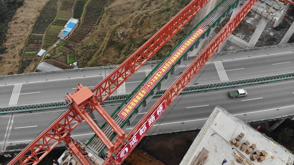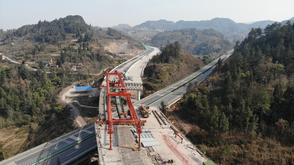 張家灣大橋是達宣快速通道的重點控制性工程,由于其上跨達萬高速公路八廟溝大橋,建成后將形成“八廟溝里橋上橋,東西南北成通衢”的交通格局。60米超高彎道跨高速橋鋼混疊合梁架設,更是全國首創(chuàng)!